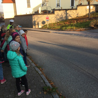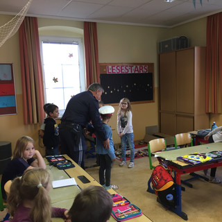Die Schülerinnen und Schüler der 1. und 2. Klasse lernten das richtige Überqueren der Straße und durften in der Klasse in die Rolle eines Polizisten schlüpfen.